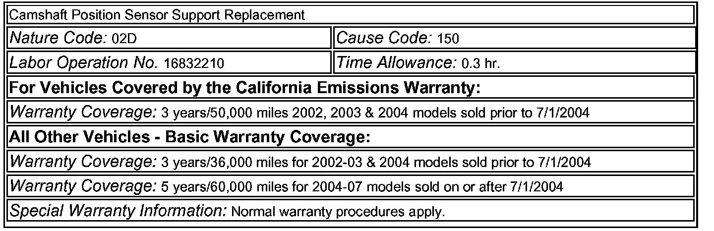 If a customer has a vehicle with the above condition, replace the camshaft position sensor support with the new part listed in the PARTS INFORMATION section of this bulletin.
