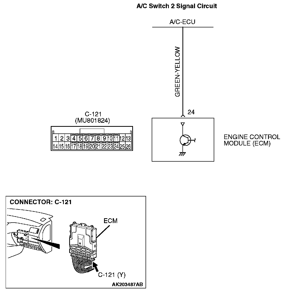 - The A/C-ECU detects how the air conditioning is applying load to the engine, and converts the information to a voltage signal (High voltage = low load, Low voltage = high load). This voltage signal is called "A/C switch 2 signal". The ECM receives this A/C switch 2 signal from the automatic compressor controller through terminal No. 24, and determines the idle-up speed according to the high or low air conditioning load.