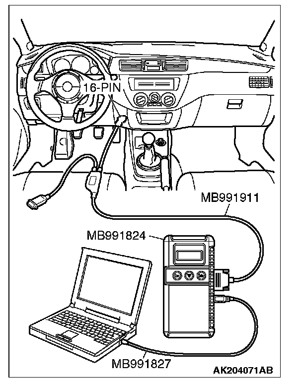 CAUTION: To prevent damage to scan tool MB991958, always turn the ignition switch is to the "LOCK" (OFF) position before connecting or disconnecting scan tool MB991958.