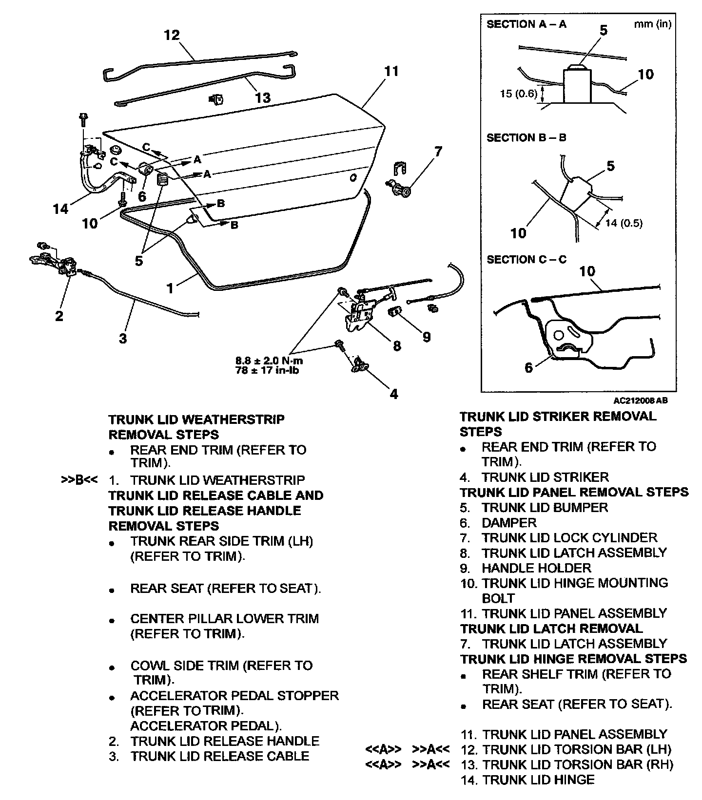 Trunk lid latch assembly bolt 8.8 ± 2.0 N.m (78 ± 17 in-lb)
