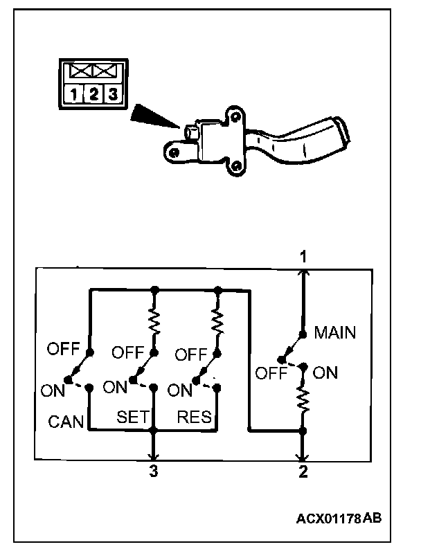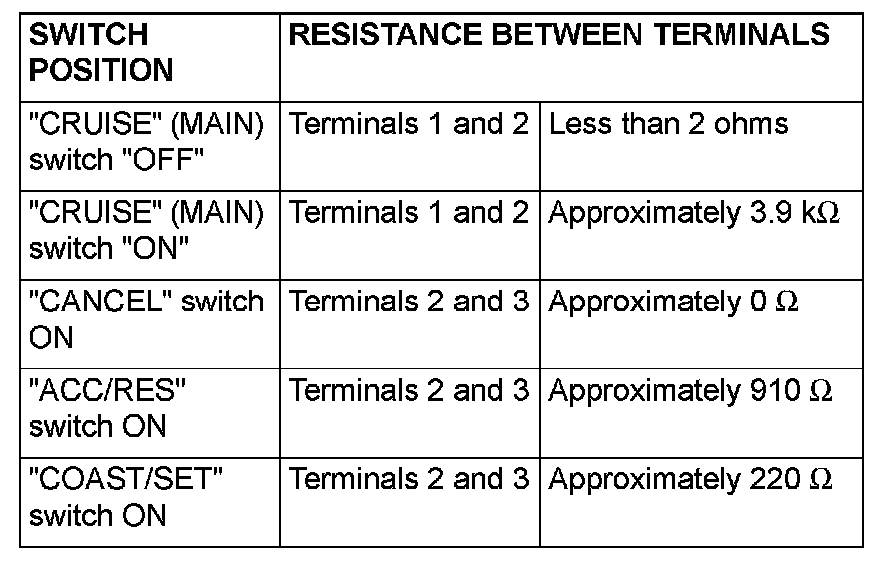 Measure the resistance between the terminals when each of the "COAST/SET", "ACC/RES", "CANCEL" and "CRUISE" (MAIN) switches is pressed. If the values measured at the time correspond to those in the table, the resistance values are correct.