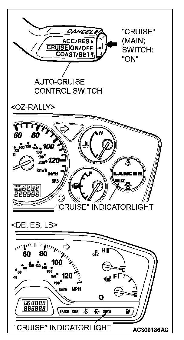 2. Check that the "CRUISE" indicator light within the combination meter illuminates when the "CRUISE" (MAIN) switch is switched "ON".
