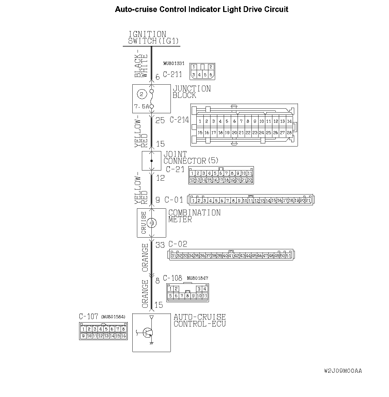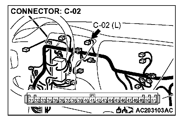 STEP 9. Check the harness wire between combination meter connector C-02 terminal 33 and auto-cruise control-ECU connector C-107 terminal 15 for damage.