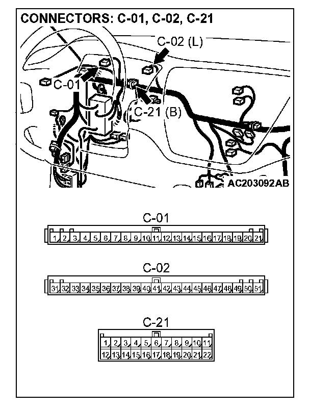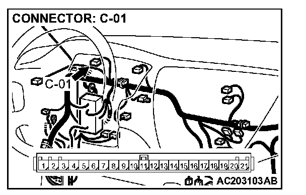 STEP 5. Check combination meter connectors C-01, C-02 and intermediate connector C-21 for loose, corroded or damaged terminals, or terminals pushed back in the connector.