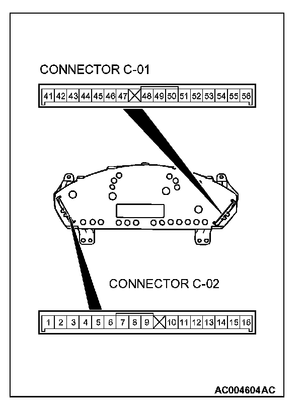 2. Measure the continuity between combination meter C-01 terminal 9 and combination meter C-02 terminal 33.