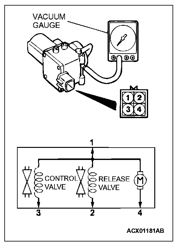 1. Connect the positive battery terminal to auto-cruise vacuum pump connector terminal 1, and the negative battery terminal to terminals 2, 3, and 4. Then the vacuum gauge should read 27 kPa (8.0 in Hg) or more.