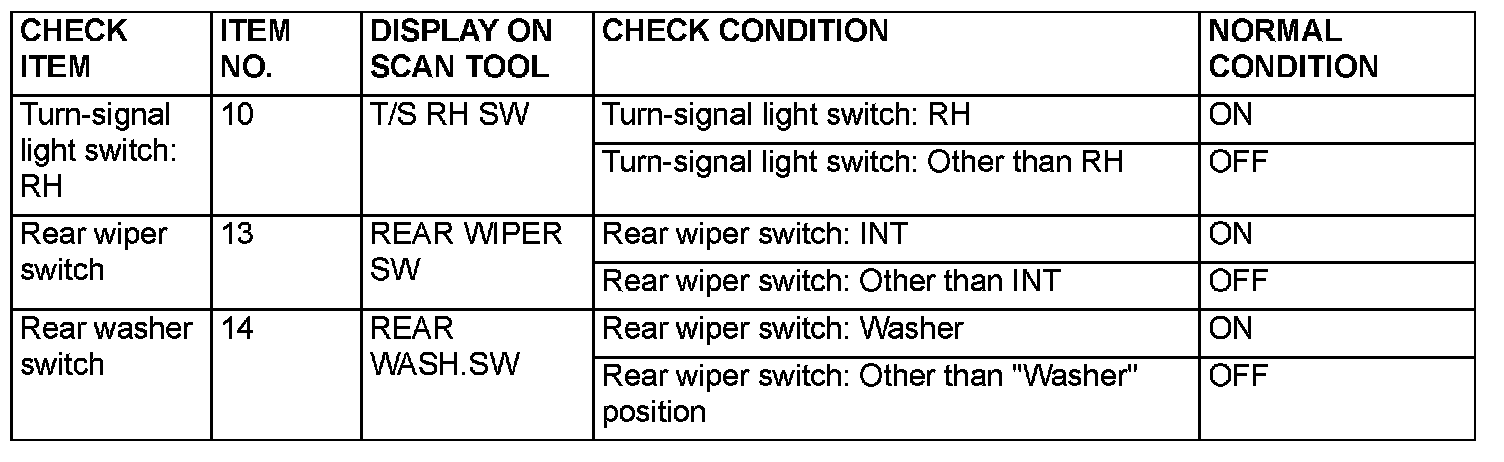For checking item "HI (High-beam)", the scan tool displays "OFF" on the item number 2 "Dimmer SW" when the headlights are at high-beam. Therefore, the scan tool should display "ON" momentarily when the dimmer switch is operated.