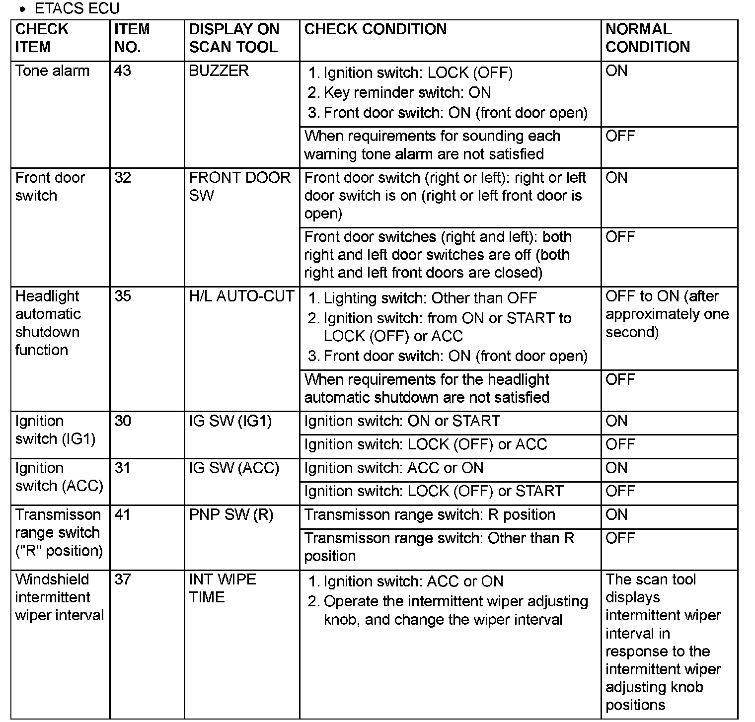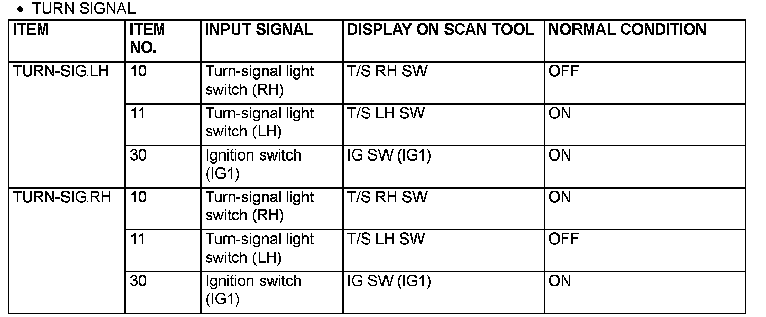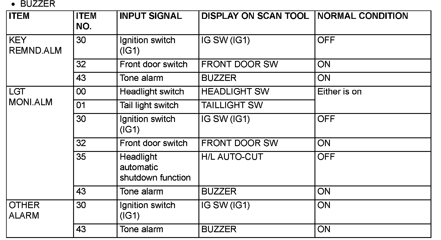 NOTE: For item number 43, the scan tool also display "ON" when the light reminder tone alarm or R (reverse) position warning tone alarm is triggered.