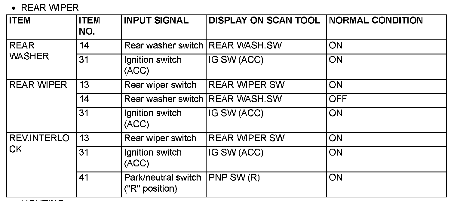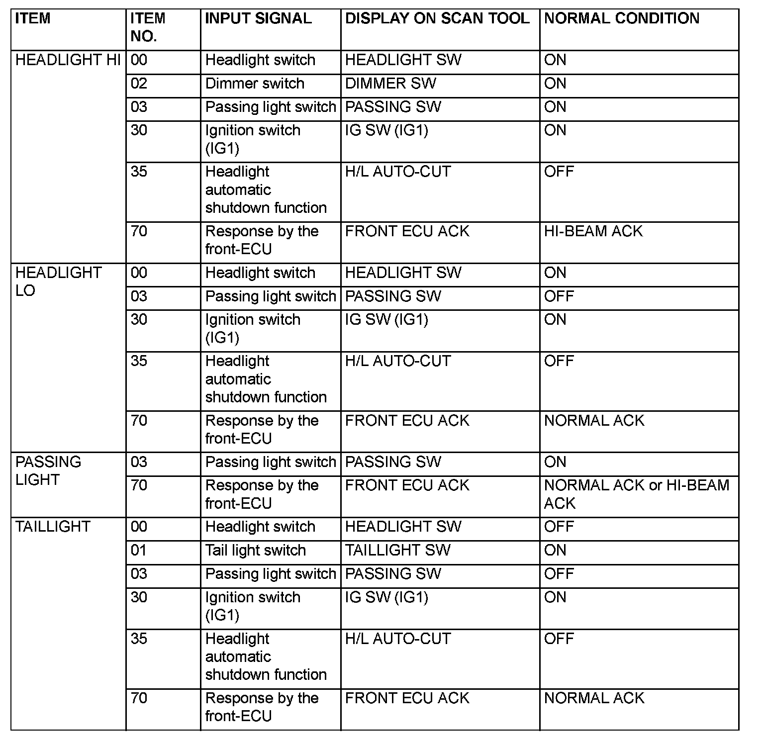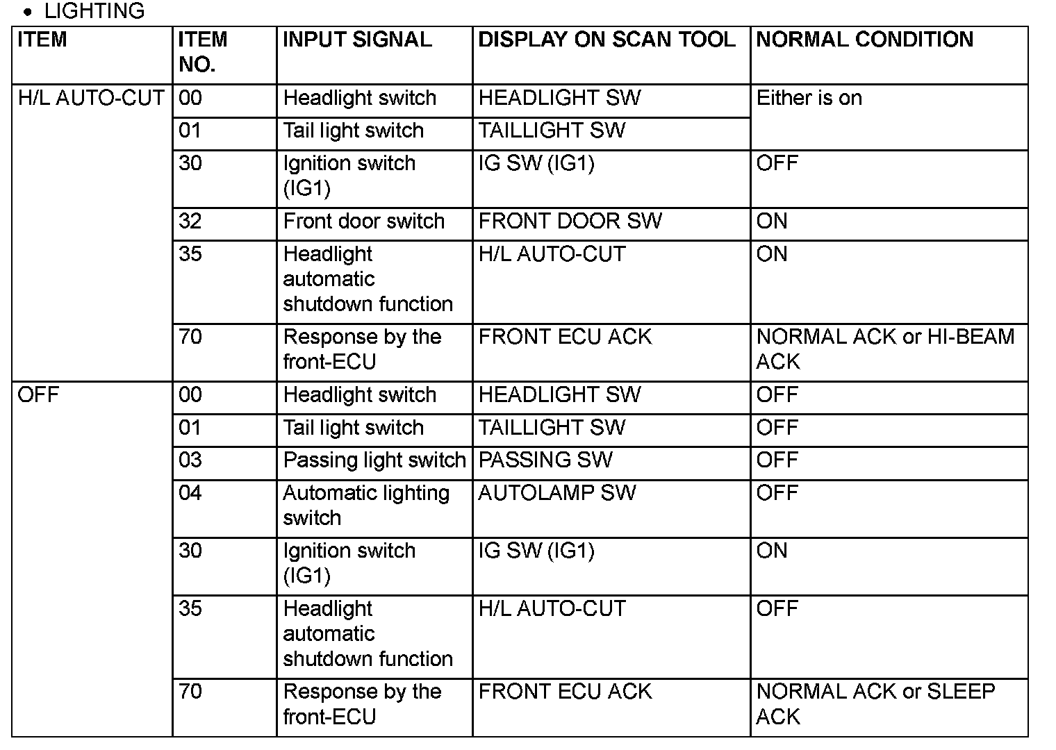 NOTE: When checking the input signals (off, tail, low-beam or high-beam), turn the ignition switch to the "ON" position in order to disable the headlight automatic shutdown function. However, the headlight operation does not depend on the ignition switch positions, the scan tool does not display the title "IGNITION SWITCH".