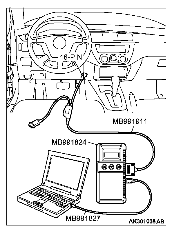 CAUTION: To prevent damage to scan tool MB991958, always turn the ignition switch to the "LOCK" (OFF) position before connecting or disconnecting scan tool MB991958.