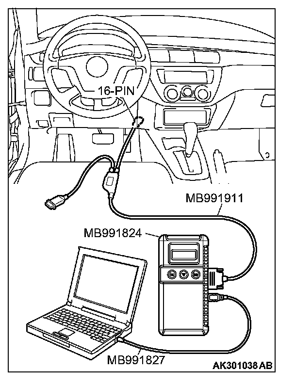 CAUTION: To prevent damage to scan tool MB991958, always turn the ignition switch to the "LOCK" (OFF) position before connecting or disconnecting scan tool MB991958.