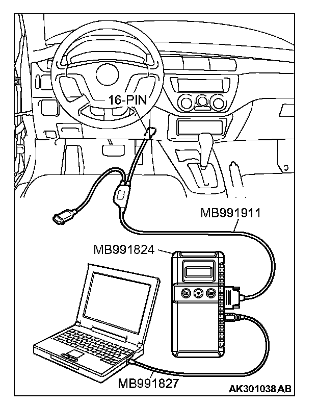 CAUTION: To prevent damage to scan tool MB991958, always turn the ignition switch to the "LOCK" (OFF) position before connecting or disconnecting scan tool MB991958.