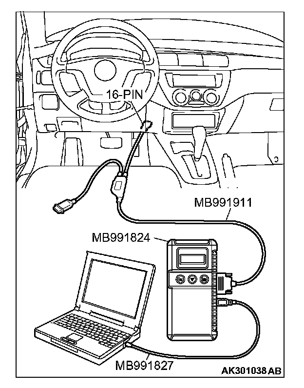 CAUTION: To prevent damage to scan tool MB991958, always turn the ignition switch to the "LOCK" (OFF) position before connecting or disconnecting scan tool MB991958.