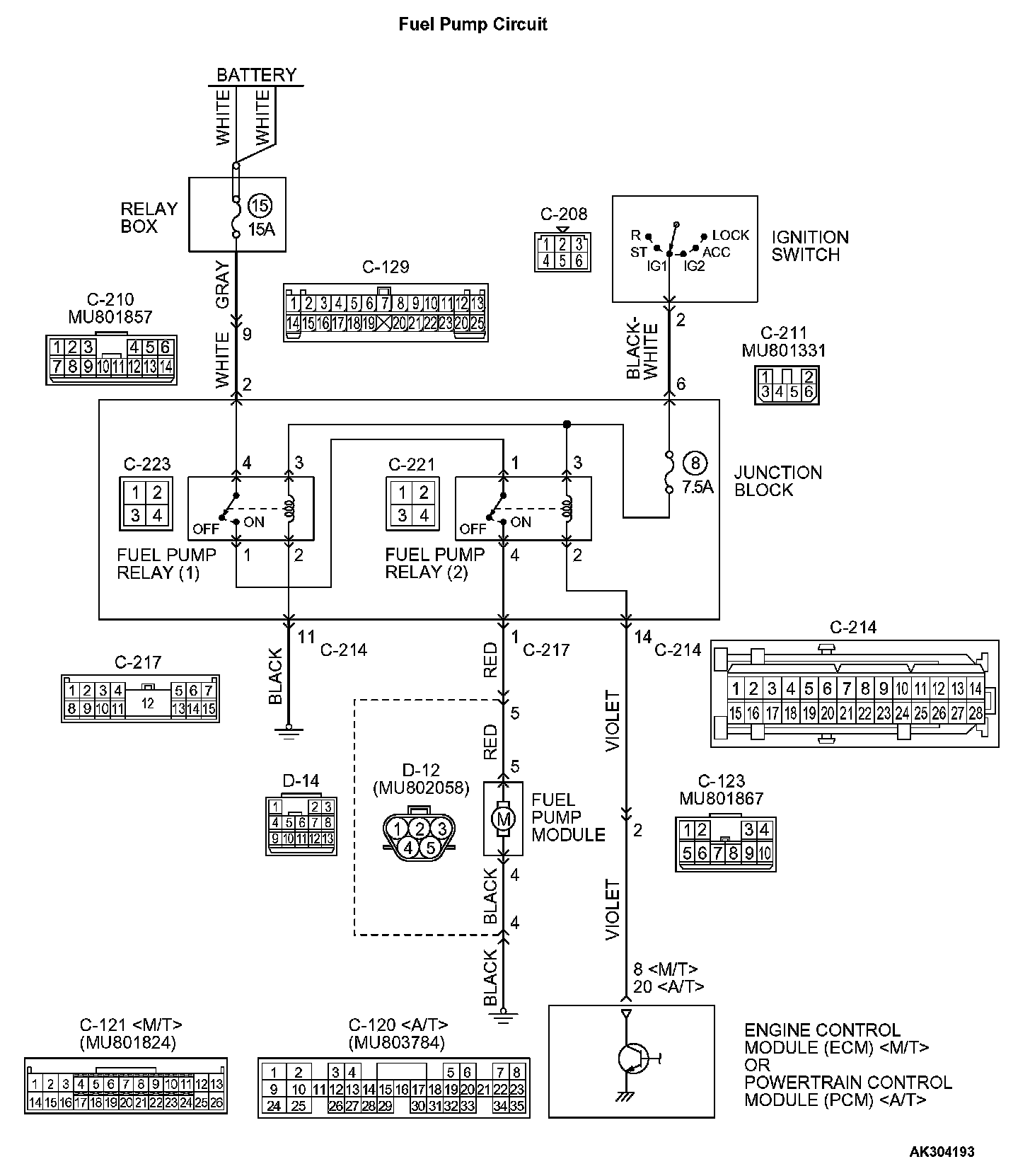 STEP 12. Check for open circuit and short circuit to ground and harness damage between fuel pump relay 2 connector C-221 (terminal No. 4) and fuel pump connector D-12 (terminal No. 5).