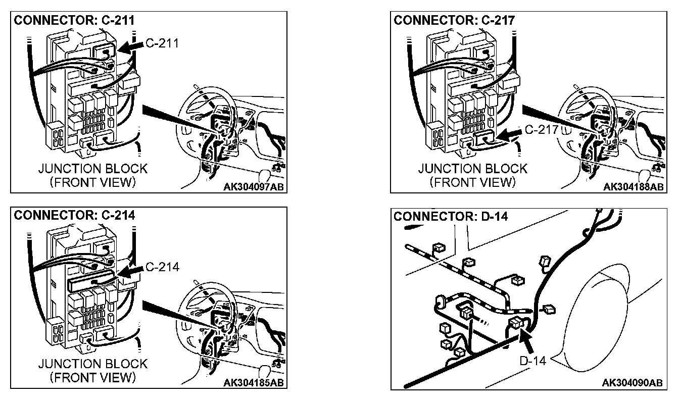NOTE: Check harness after checking intermediate connectors C-217 and D-14. If intermediate connectors are damaged, repair or replace them. After to Harness Connector Inspection. Then check that the malfunction is eliminated.