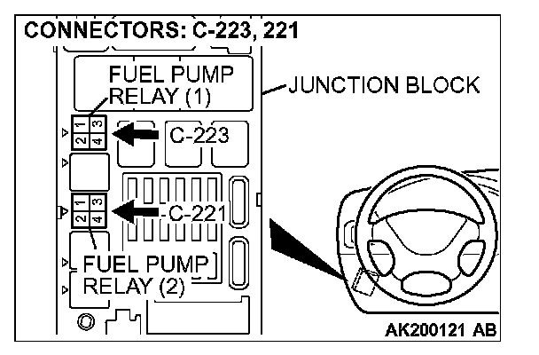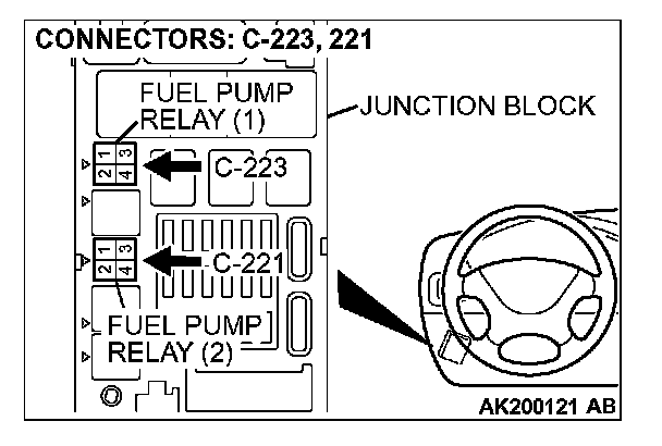 STEP 2. Check harness connector C-223 at fuel pump relay 1 and harness connector C-221 at fuel pump relay 2 for damage.
