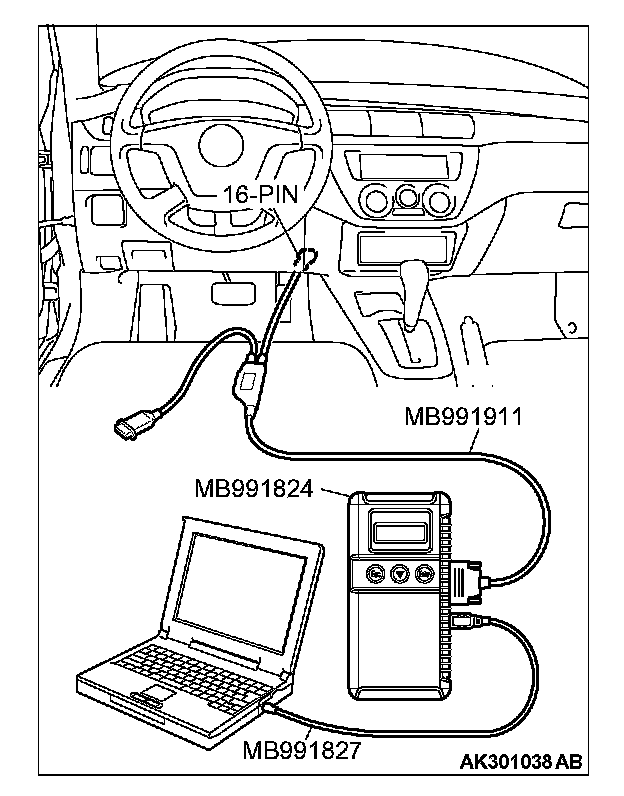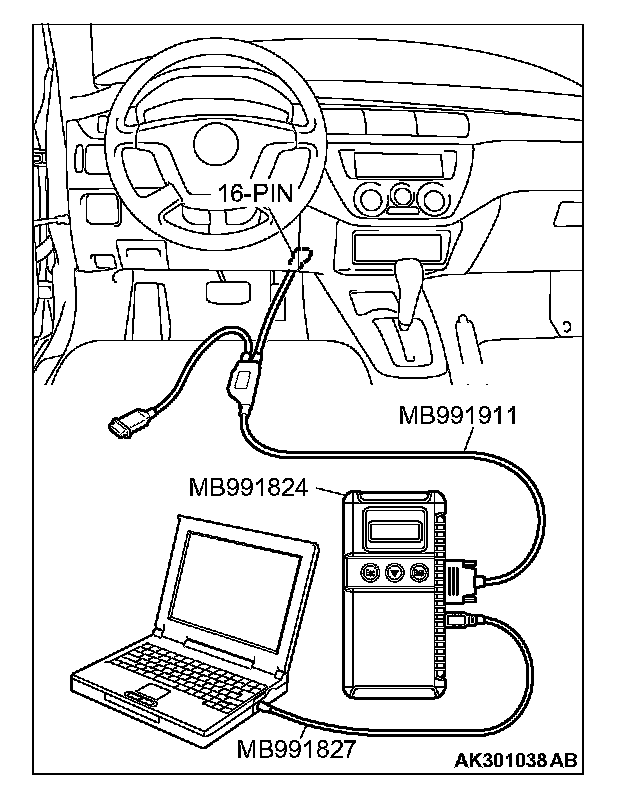 CAUTION: To prevent damage to scan tool MB991958, always turn the ignition switch to the "LOCK" (OFF) position before connecting or disconnecting scan tool MB991958.