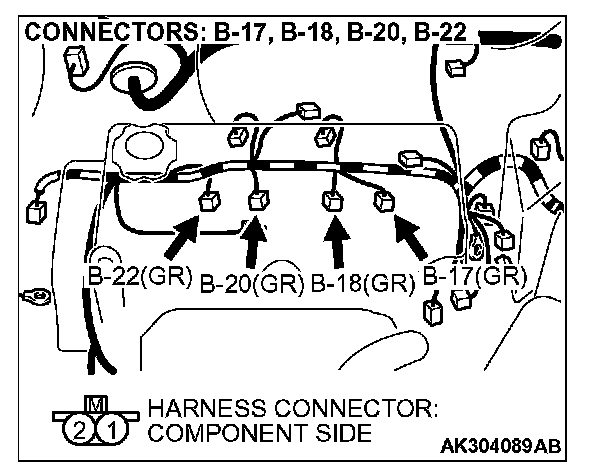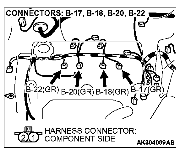 STEP 8. Check harness connectors B-22, B-20, B-18 and B-17 at injector for damage.