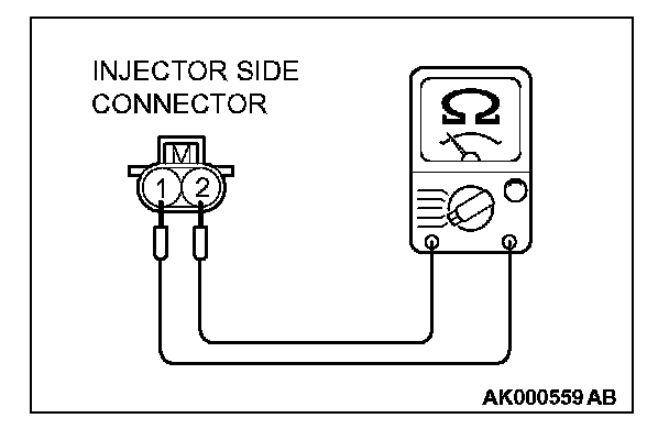 2. Measure the resistance between each injector side connector terminal No. 1 and No. 2.