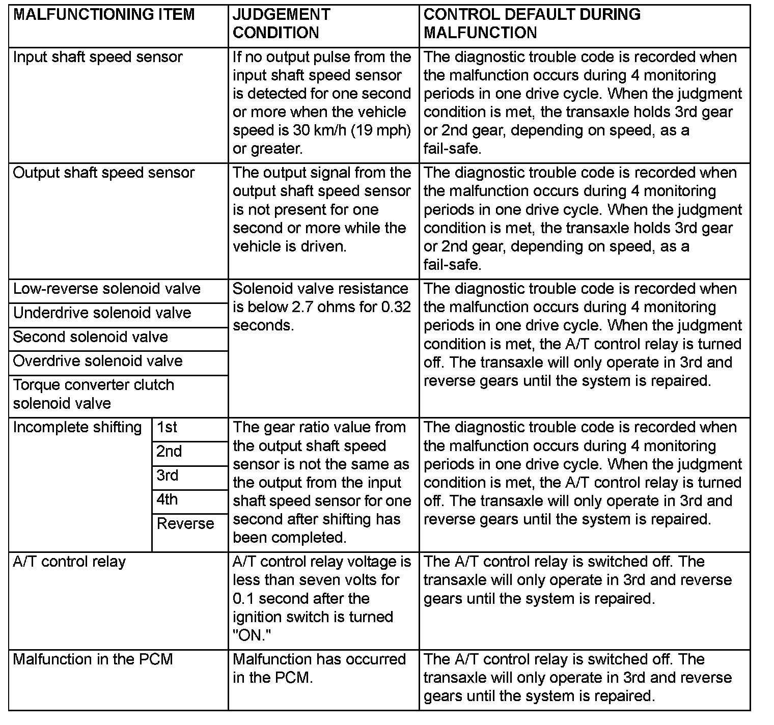 When a malfunction of a main sensor or actuator is detected by the PCM, the transaxle is controlled by pre-set control logic to maintain safe conditions for driving.