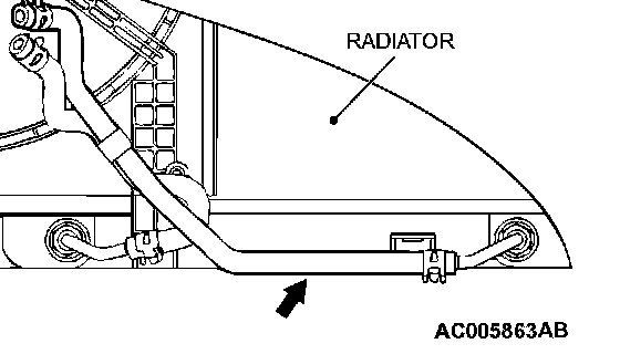 1. Disconnect the hose shown in the illustration which connects the transaxle and the oil cooler (inside the radiator). Place a container under the hose to collect the discharge.