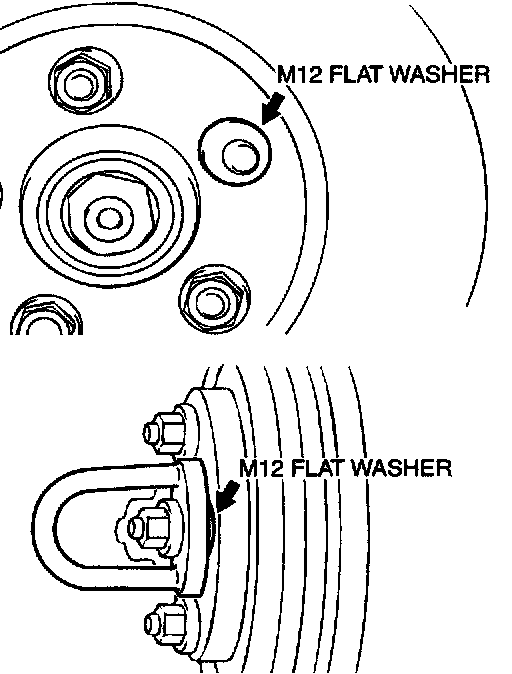 ^ When the on-the-car type lathe is used, first install M12 flat washer on the stud bolt in the brake disc side according to the figure, and then install the adapter. If the adapter is installed with M12 flat washer not seated, the brake disc rotor may be deformed, resulting in inaccurate grinding.