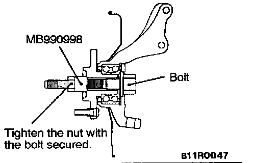 2) Attach special tool MB990998 to the front hub assembly as shown in the illustration, and tighten it to the specified torque.