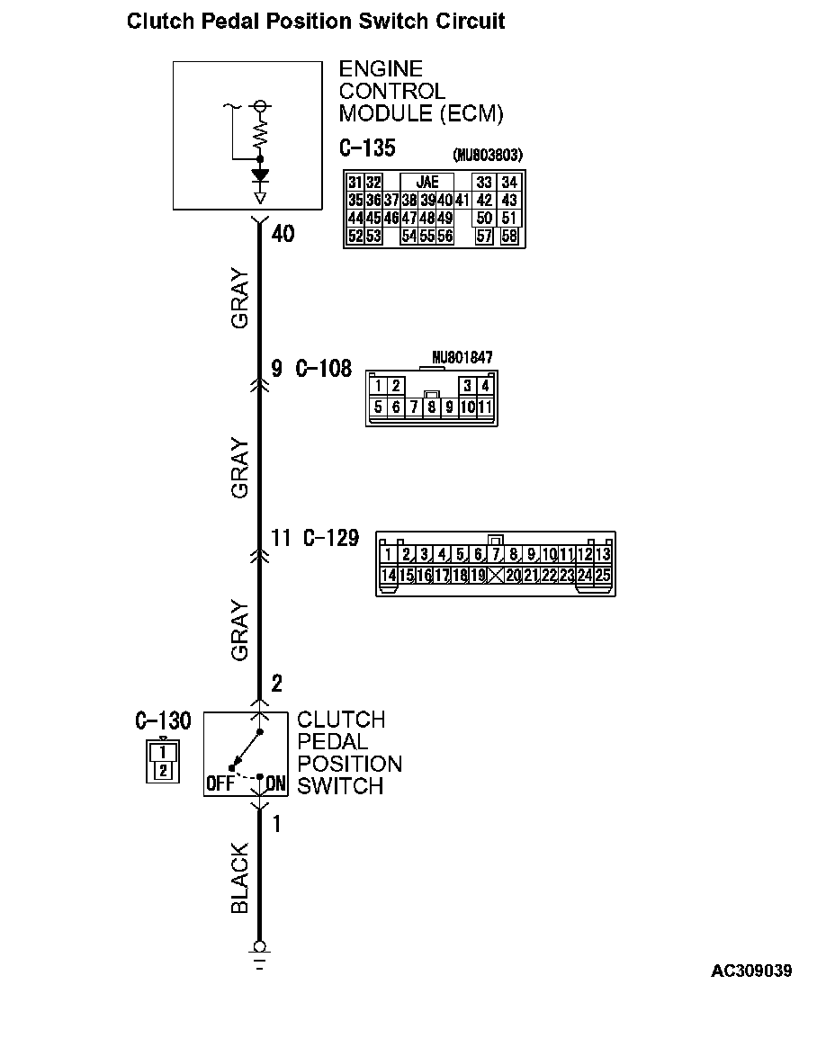 This circuit indicates the operation status of the clutch pedal position switch. When the clutch pedal position switch is ON (clutch pedal is depressed), the voltage of ECM terminal number 40 will indicate 0 volt.