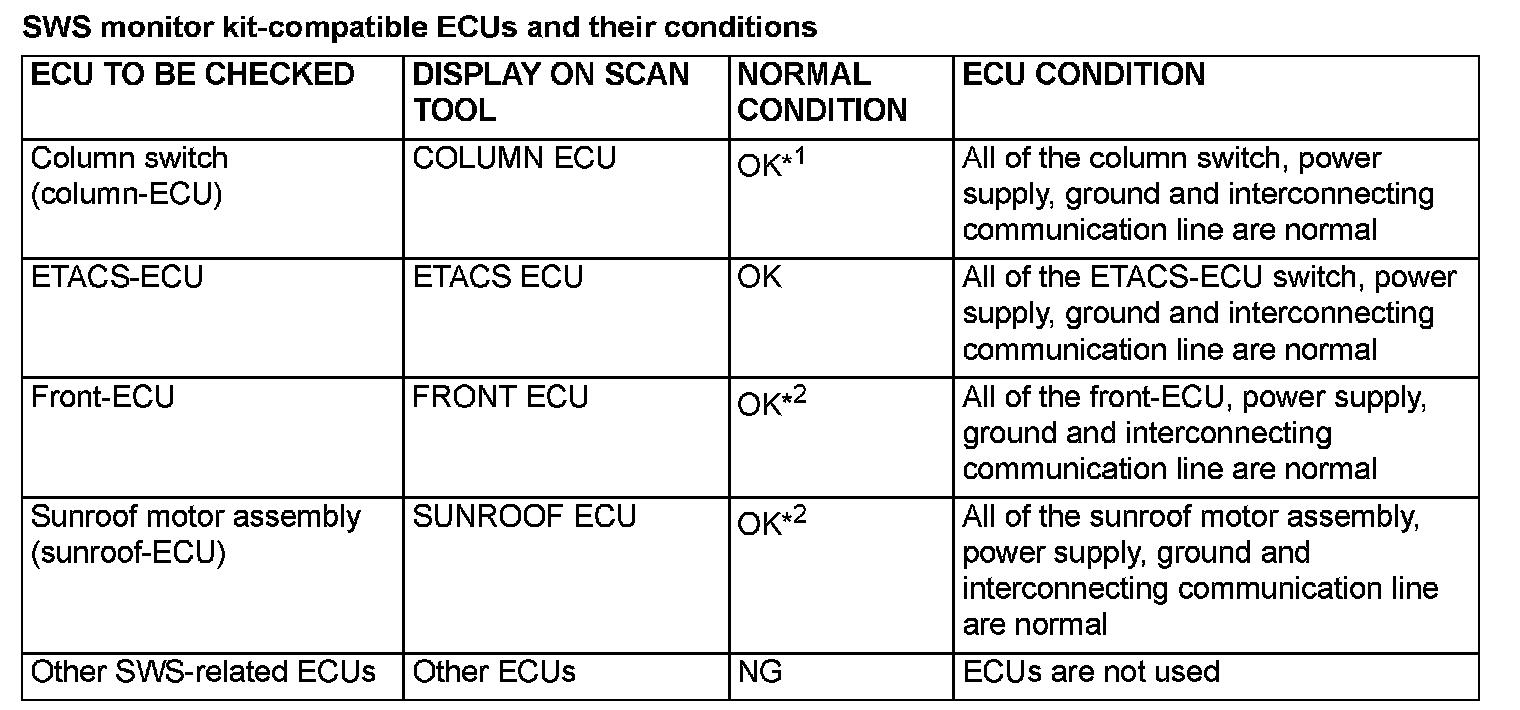 2. The given ECUs can be checked by using the scan tool MB991958 and the SWS monitor kit.