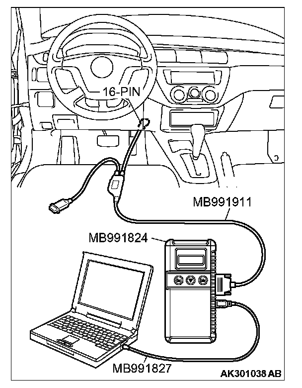 CAUTION: To prevent damage to scan tool MB991958, always turn the ignition switch to the "LOCK" (OFF) position before connecting or disconnecting scan tool MB991958.