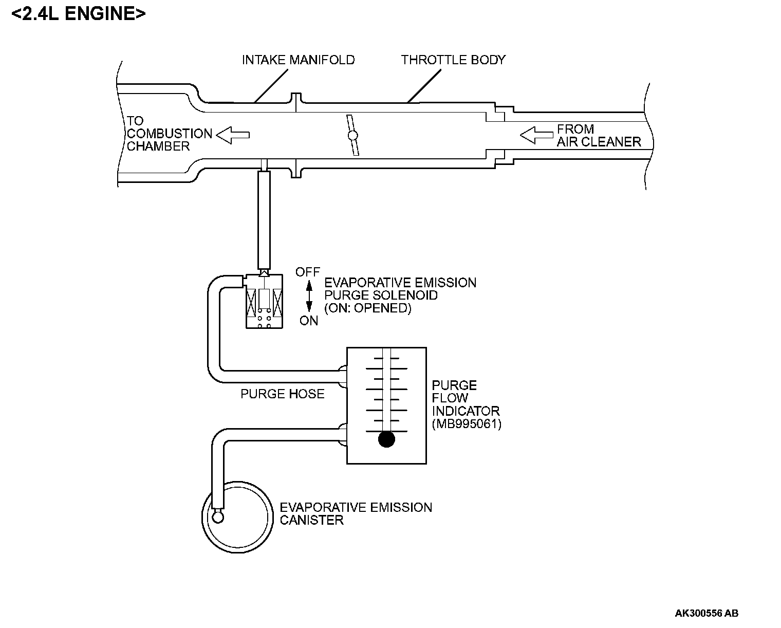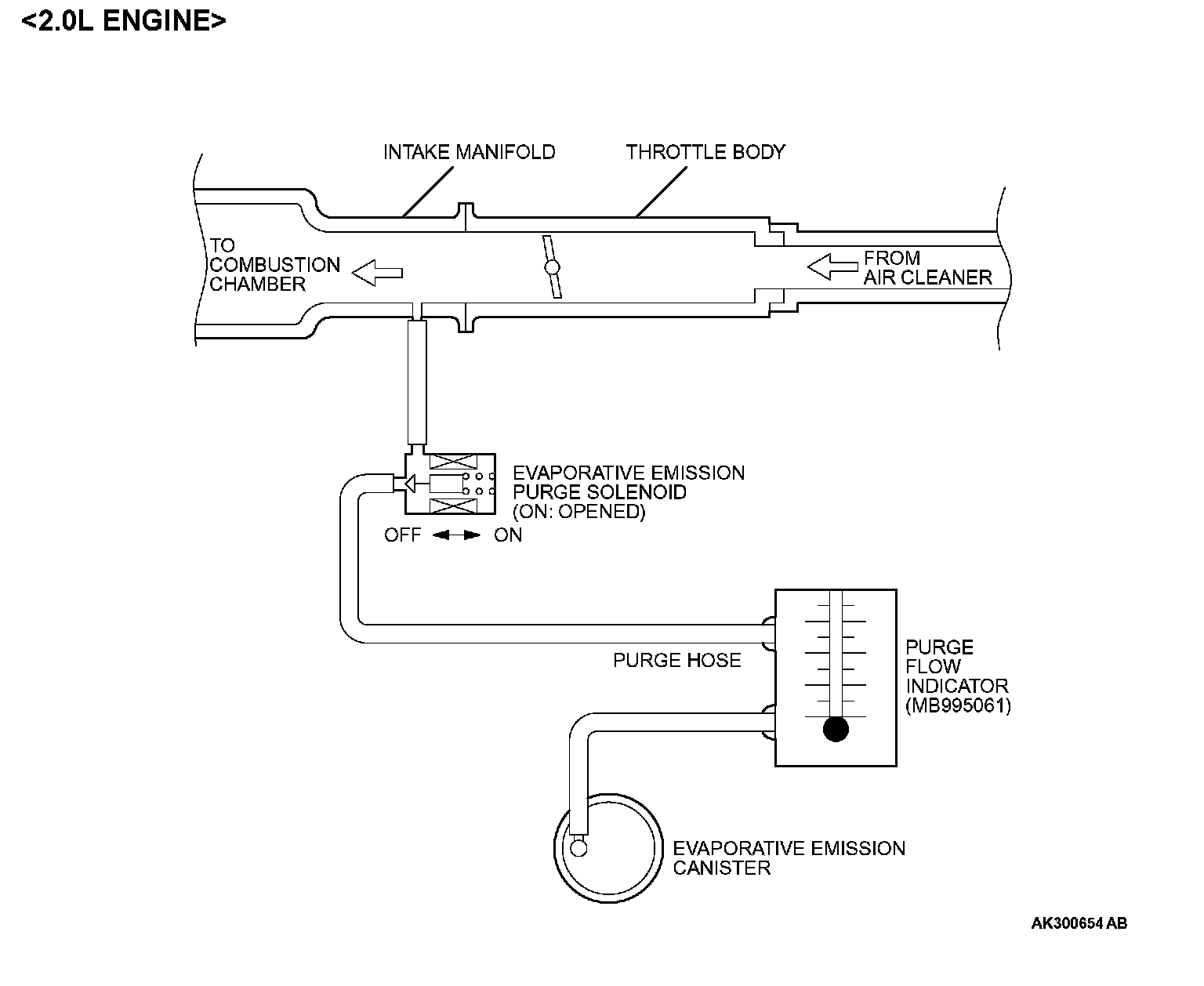 1. Disconnect the purge hose from the evaporative emission (EVAP) purge solenoid, and connect special tool MB995061 between the EVAP purge solenoid and the purge hose.