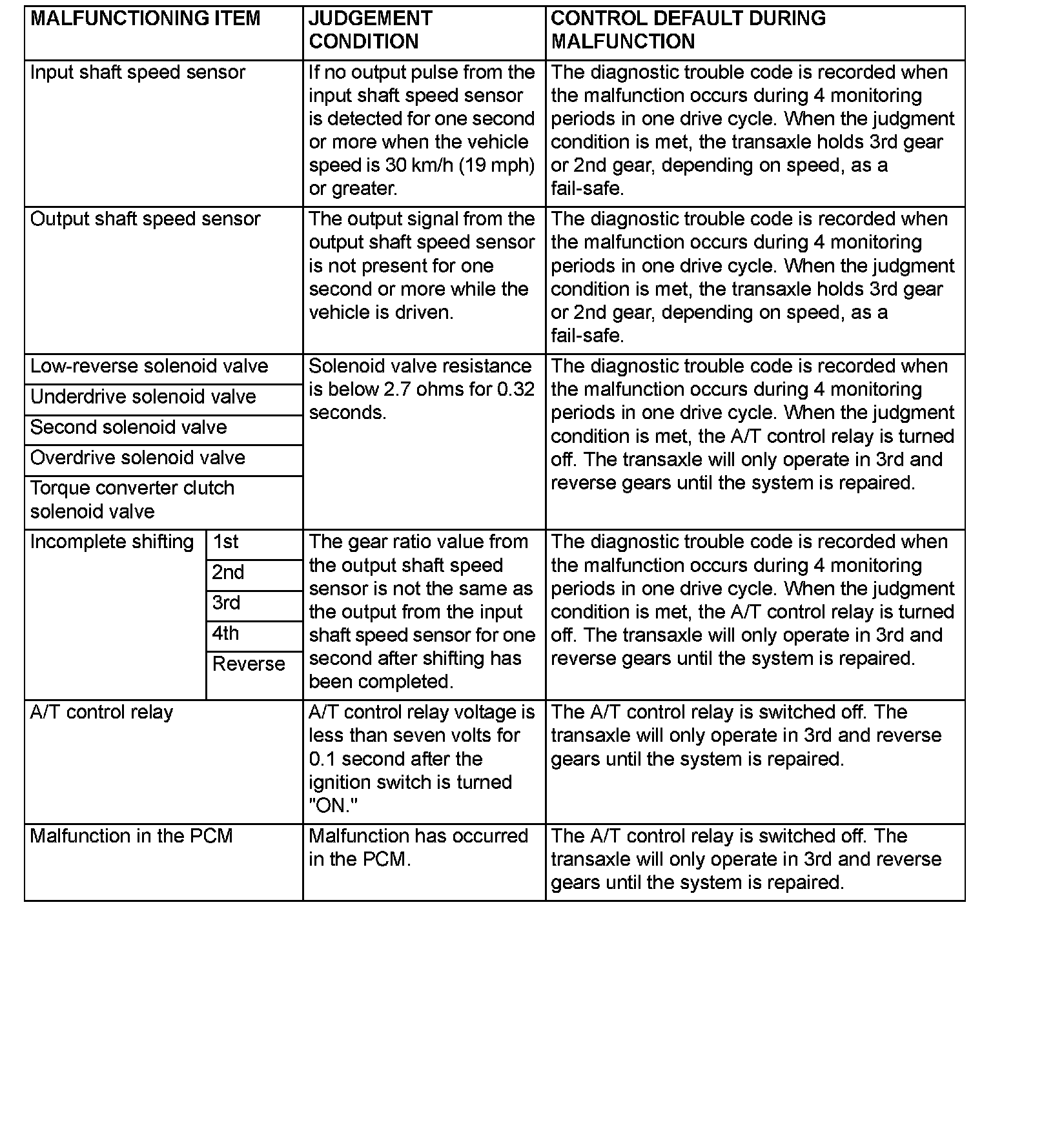 When a malfunction of a main sensor or actuator is detected by the PCM, the transaxle is controlled by pre-set control logic to maintain safe conditions for driving.