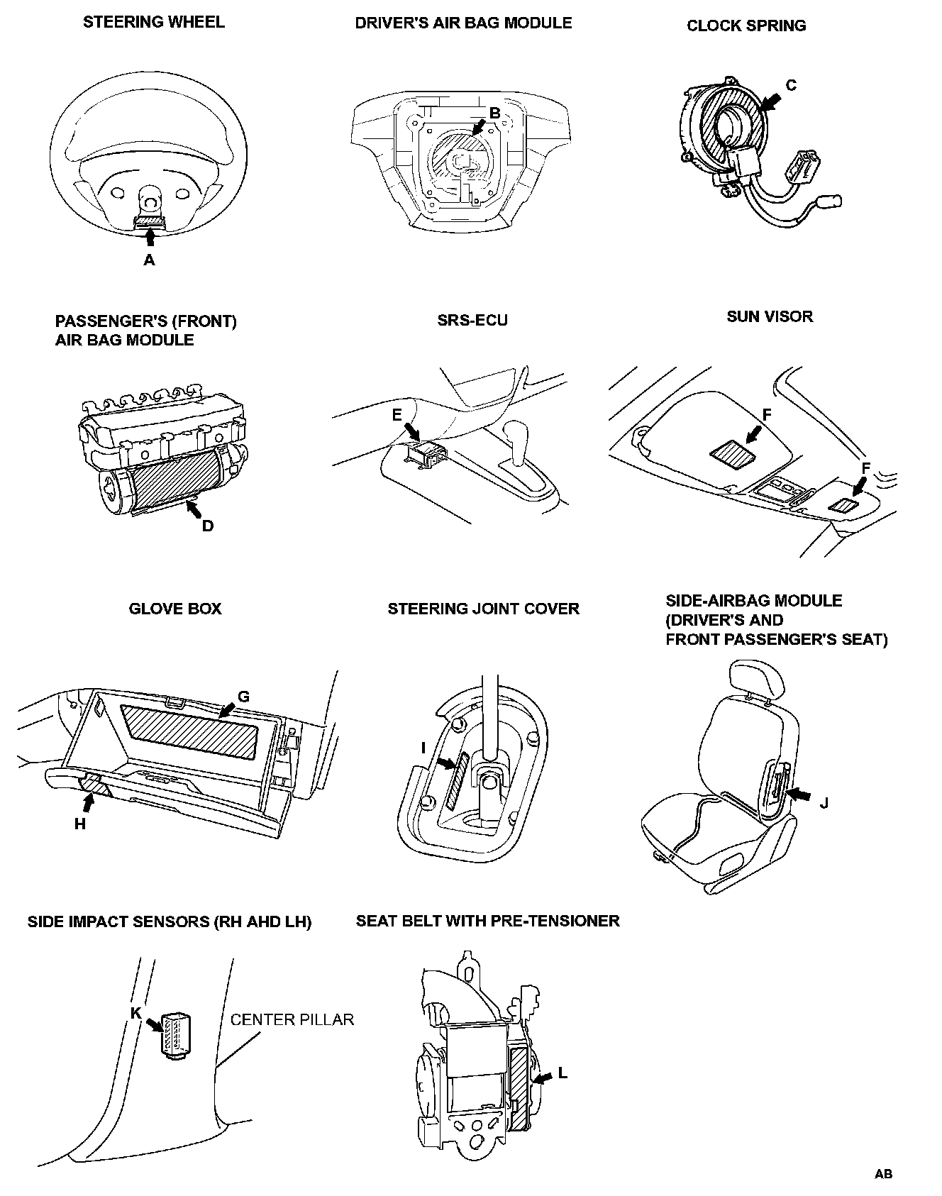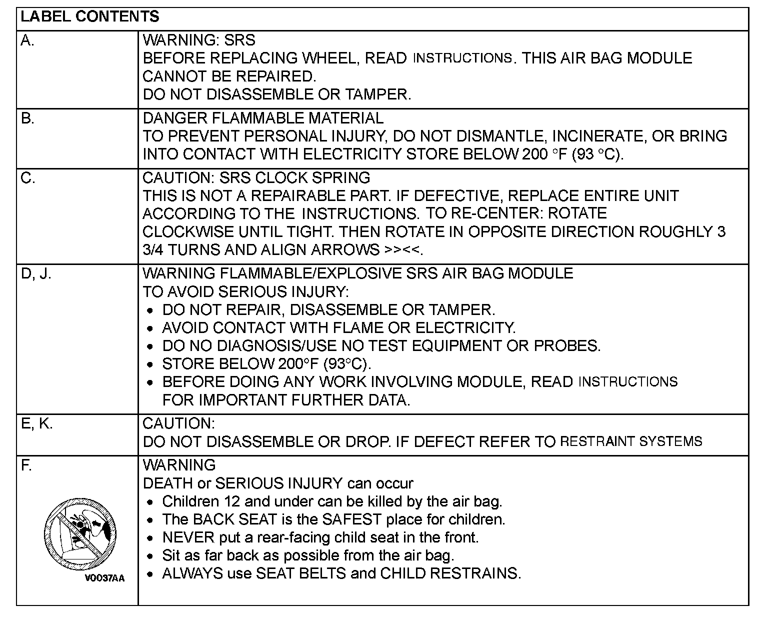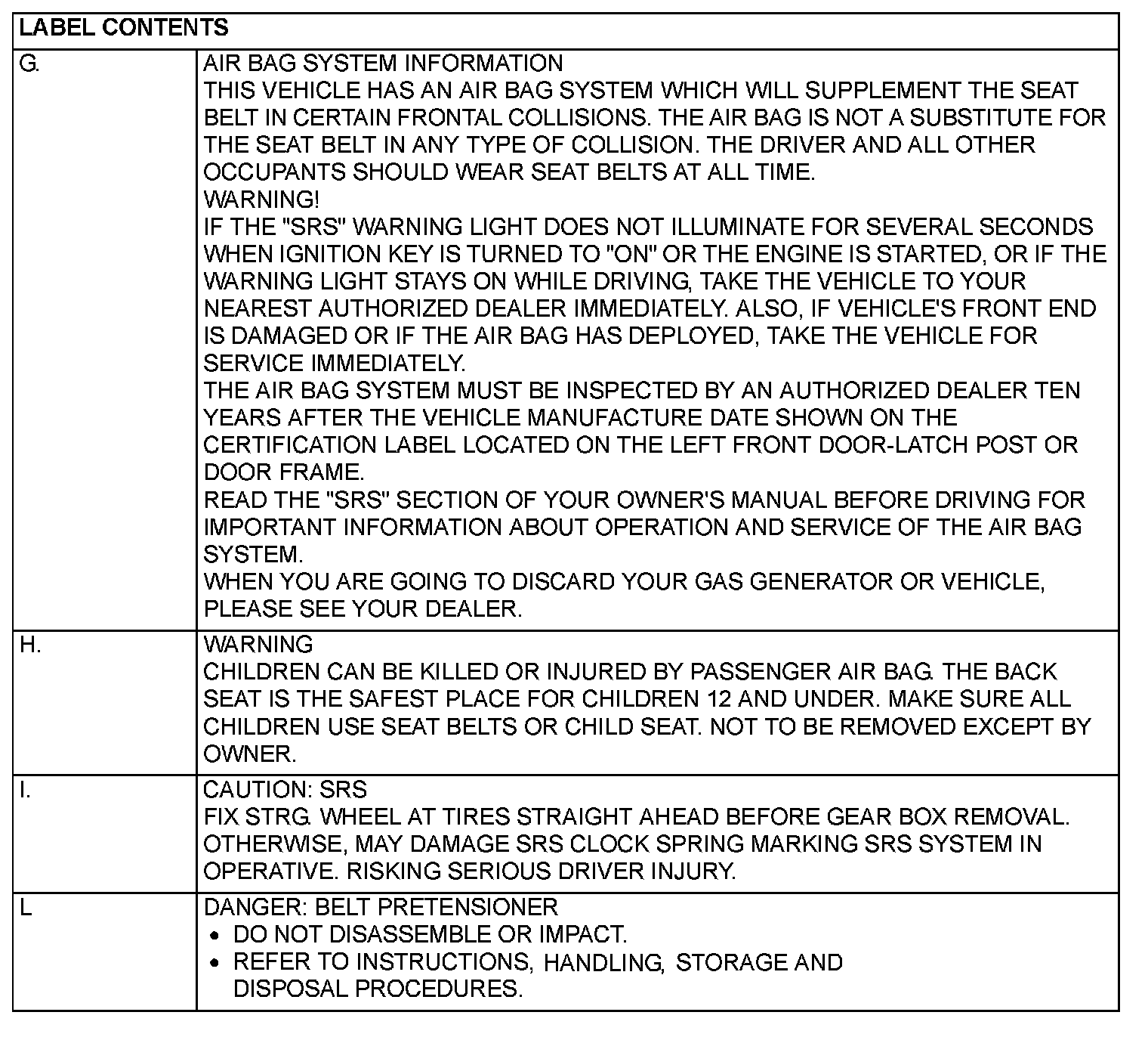 A number of caution labels related to the SRS are found in the vehicle, as shown in the illustration. Follow label instructions when servicing SRS. The label H is not to be removed except by owner. If the other labels are dirty or damaged, replace them.