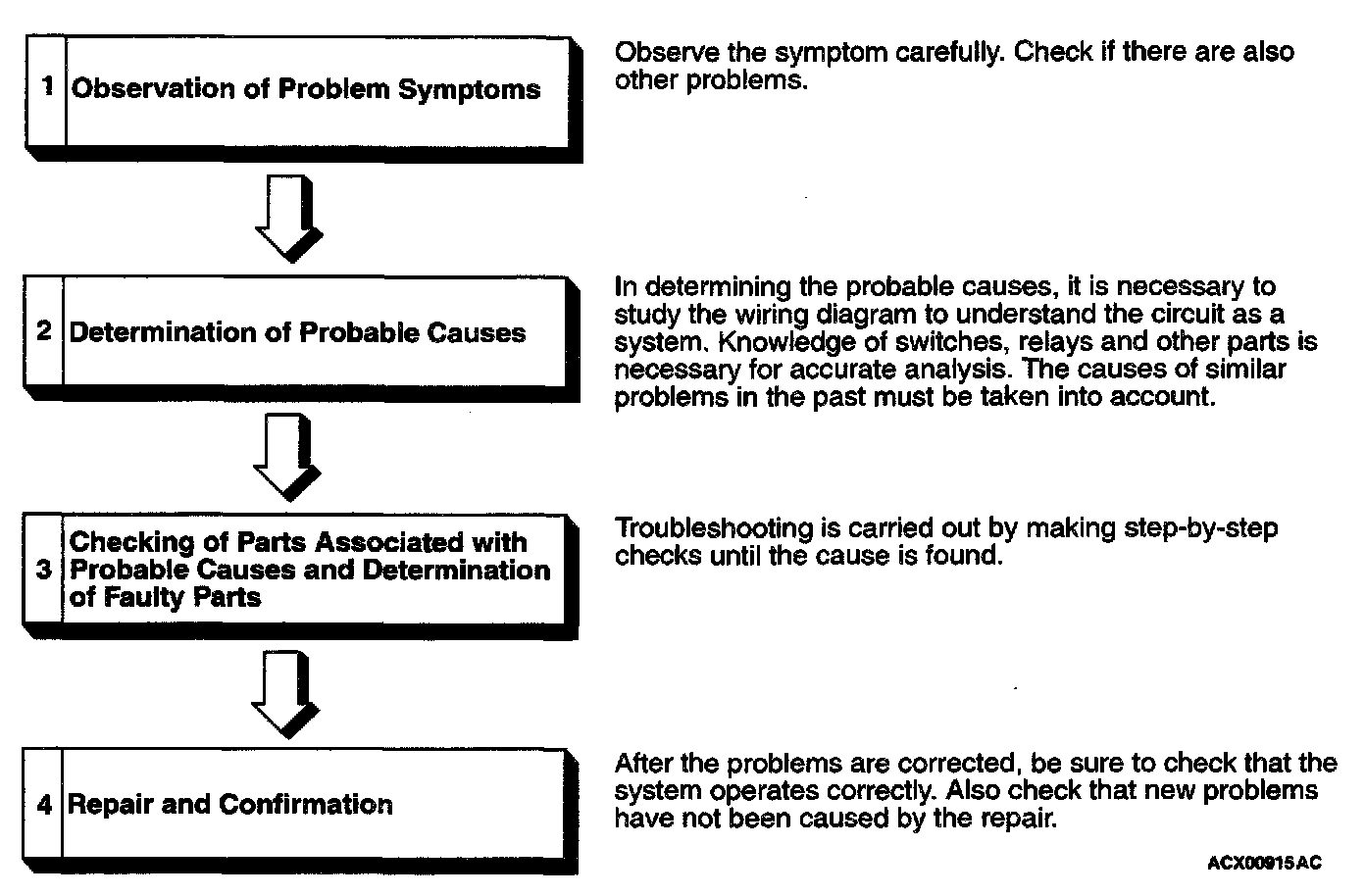 If an attempt is made to solve a problem without going through correct steps for troubleshooting, the symptoms could become more complicated, resulting in failure to determine the causes correctly and making incorrect repairs. The four steps below should be followed in troubleshooting.