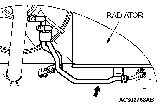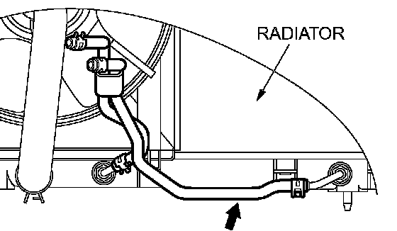 1. Disconnect the hose shown in the illustration which connects the transaxle and the oil cooler (inside the radiator). Place a container under the hose to collect the discharge.