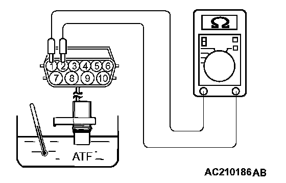 2. Measure the resistance between terminals 1 and 2 of the transmission fluid temperature sensor connector.