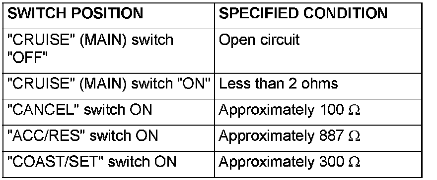 2. Measure the resistance between terminal 2 and terminal 3 when each of the "COAST/SET", "ACC/RES", "CANCEL" and "CRUISE" (MAIN) switches is pressed. If the values measured at the time correspond to those in the table, the resistance values are correct.