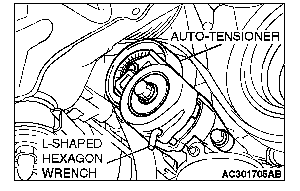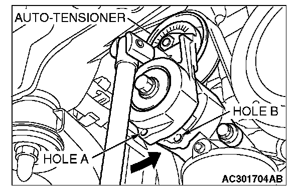 2. Rotate the auto-tensioner counterclockwise and align hole A with hole B.