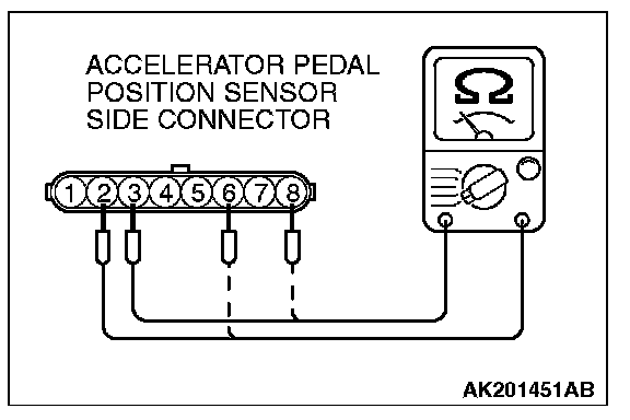 3. Measure the resistance between accelerator pedal position sensor connector terminal No. 2 [accelerator pedal position sensor (main) power supply] and terminal No. 3 [accelerator pedal position sensor (main) output]; and between terminal No.8 [accelerator pedal position sensor (sub) power supply] and terminal No. 6 [accelerator pedal position sensor (sub) output].