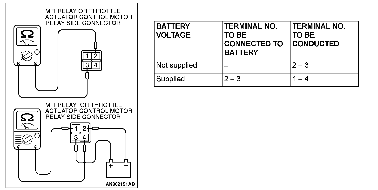 Inspect the MFI relay and throttle actuator control motor relay for continuity in accordance with the chart.