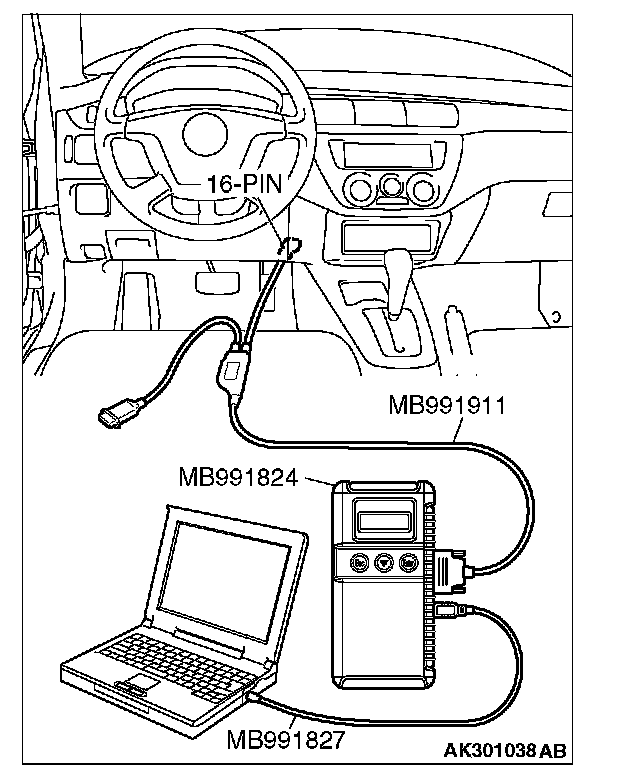 CAUTION: To prevent damage to scan tool MB991958, always turn the ignition switch to the "LOCK" (OFF) position before connecting or disconnecting scan tool MB991958.