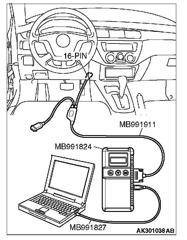 CAUTION: To prevent damage to scan tool MB991958, always turn the ignition switch to the "LOCK" (OFF) position before connecting or disconnecting scan tool MB991958.