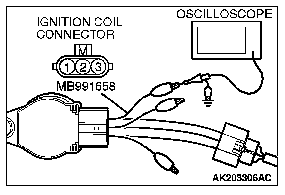 1. Disconnect the ignition coil connector, and connect test harness special tool (MB991658) between the separated connector. (All terminals should be connected.)