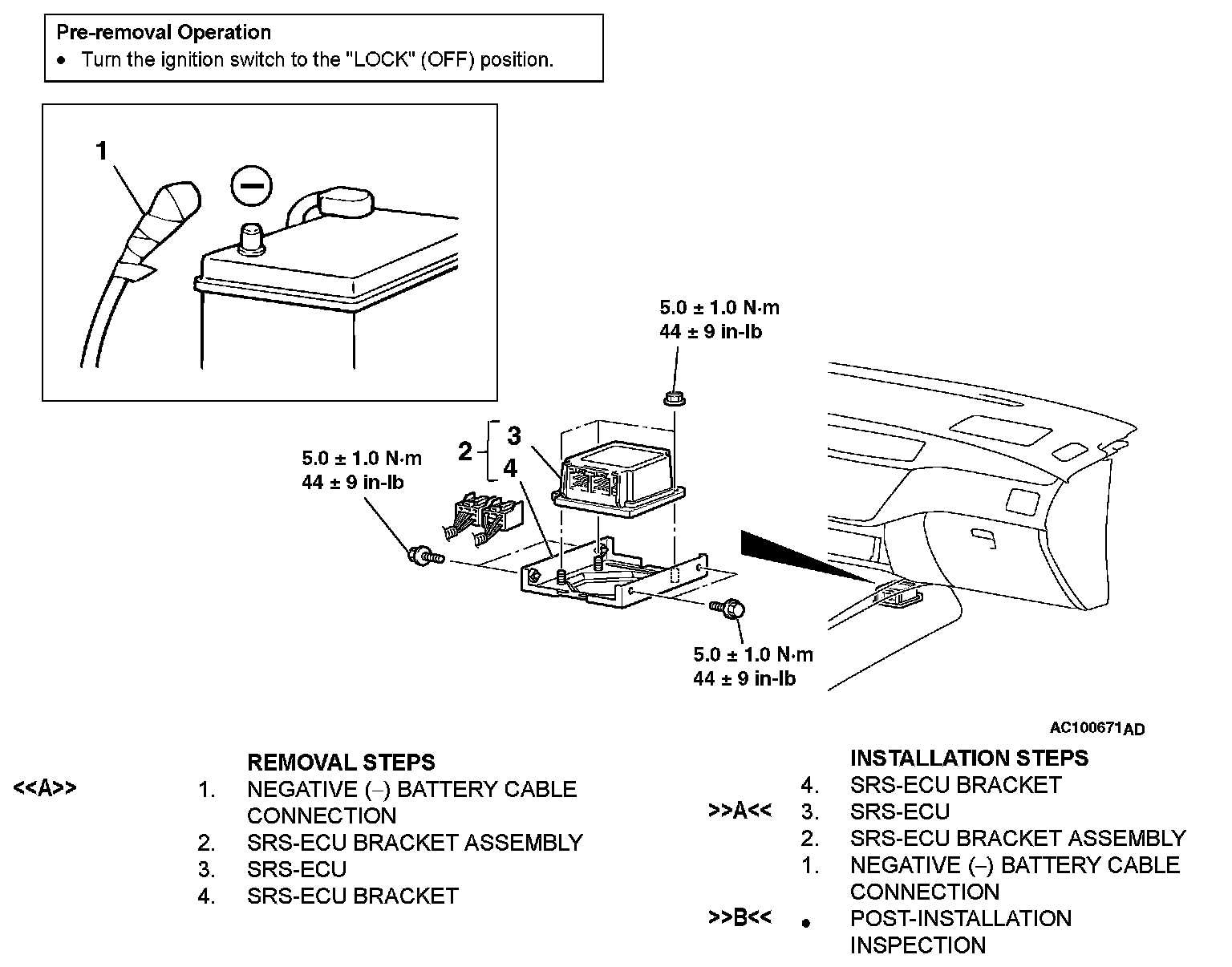 - Do not drop or subject the SRS-ECU to impact or vibration. If denting, cracking, deformation, or rust are discovered in the SRS-ECU, replace it with a new SRS-ECU. Discard the old one.