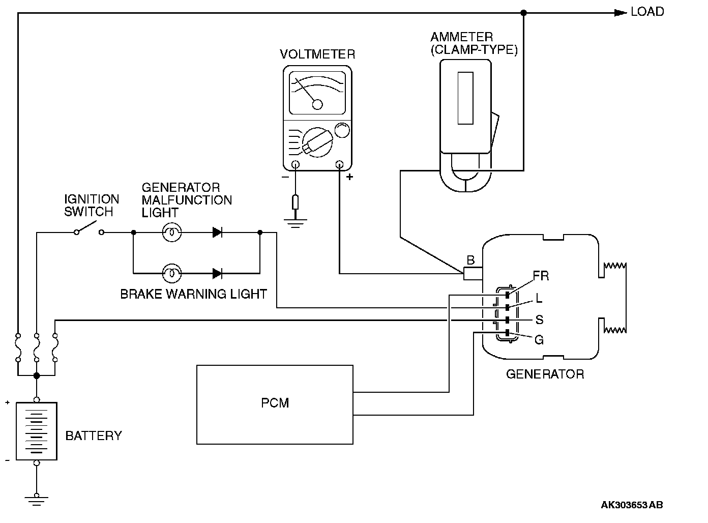 4. Connect a clamp-type DC test ammeter with a range of 0 - 100 A to the generator "B" terminal output wire.