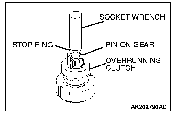 1. Press a long socket wrench to the stop ring. Then tap the socket wrench to remove the stop ring to the pinion gear side.