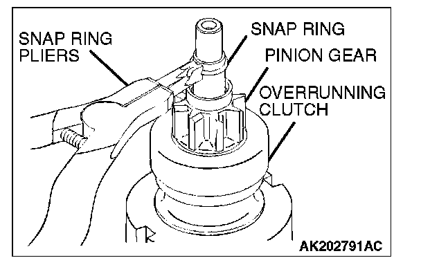 2. After removing the snap ring (by using snap-ring pliers), remove the stop ring and the overrunning clutch.
