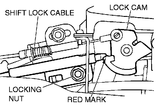 4. Adjust the cable so that the end of the shift lock cable is above the red line on the lock cam and tighten the locknut.