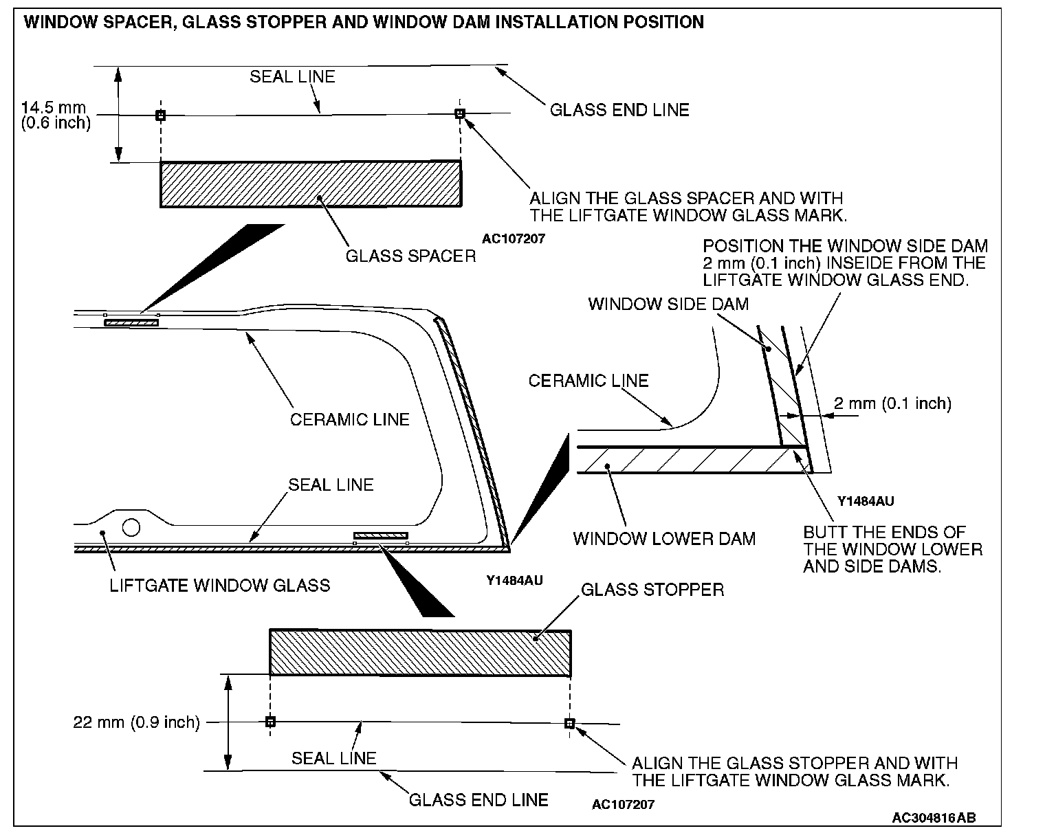 2. Assemble the window spacer, glass stopper and window dam to the liftgate window glass location shown.