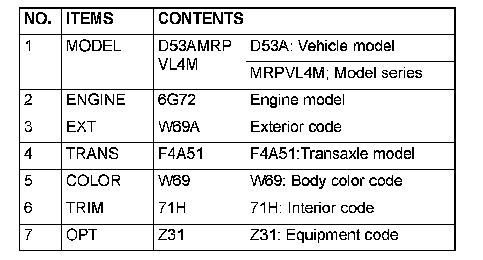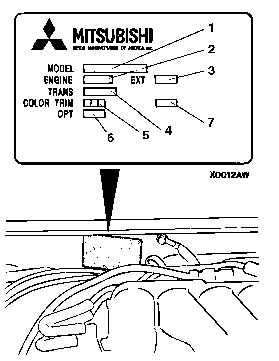 The vehicle information code plate is riveted onto the cowl top outer panel in the engine compartment. The plate shows model code, engine model, transaxle model and body color code.
